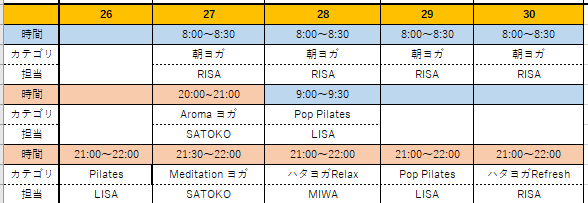 4/1~4/30まで、朝8:00/9:00〜ヨガ、ポップピラティス、親子ヨガ、夜20:00〜/21:00〜ヨガ・アロマヨガ・ピラティス・ポップピラティス・フローピラティスが日替わりで受けられます!